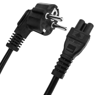 Cable de alimentación estándar con conector Schuko CEE 7/7 en codo en un extremo para conexión a pared y conector IEC-C5 (tipo trébol o Mickey) en el otro extremo para conexión a dispositivo.