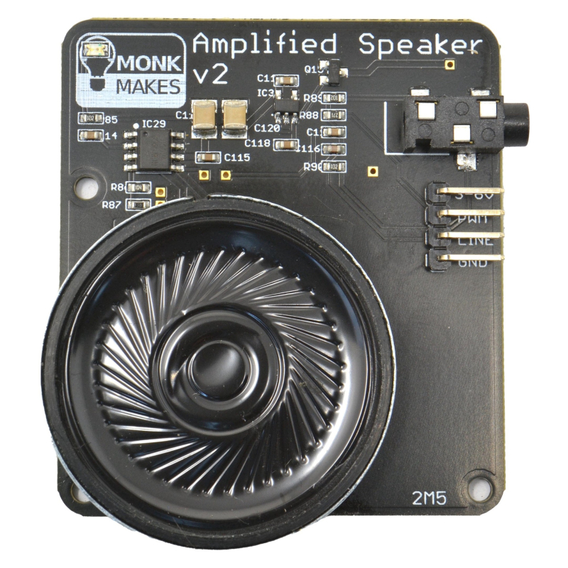 ¡Sube el volumen con el altavoz amplificado Monk Makes! Este altavoz compacto y fácil de usar está montado en una placa de circuitos y requiere una fuente de alimentación de 3,3 a 6 V, que puede ser suministrada por una Raspberry Pi o una placa Arduino. Cuenta con una toma de audio estéreo de 3,5 mm para la entrada de audio, que se convierte en una señal mono. Además, incluye una entrada independiente con un filtro de paso bajo para su uso con audio PWM/PCM.